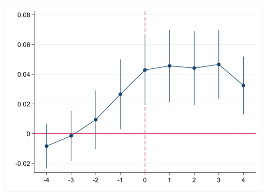 where Dkit is a policy dummy variable of each city based on the policy start year. When the city is in the kth year before the pilot, D−kit takes the value 1, and the rest is 0. When the city is in the kth year after the pilot, Dkit takes the value 1, and the rest is 0. The meaning of the remaining variables remains unchanged. In Figure 1, the estimated results of the coefficients from D−4it to D−2it indicated that there was no difference in the change trend of Pcni among cities before the introduction of the policy. The reason for the significant coefficient of D−1it may be the predictability of the policy, as farmers predicted the direction of the future policy development and responded in advance. Farmers have a lower expected value of production risk when they know that AISP will be implemented in their area. Therefore, farmers expand the scale of production in advance to gain more benefits. Overall, the test results basically met the parallel trend hypothesis.