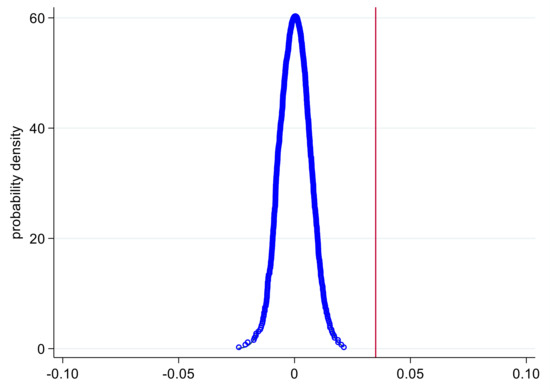 Considering the characteristics of the step-by-step pilot of AISP, this paper conducted random non-replacement sampling according to the number of pilot cities in different years. For example, there were 78 pilot cities in 2007, so 78 cities were randomly selected from all 316 cities. This paper assumed that the selected cities began to implement AISP in 2007. Then, the “pseudo” policy dummy variable (Dit*) was created to replace Dit in Equation (1). After all sampling was over, a benchmark regression was performed on the new model. At this time, the order of the pilot program was different from the actual one, and AISP should not have had the effect of increasing income. The coefficient (β1*) of the “pseudo” policy dummy variable should be close to 0. The kernel density figure of β1* was drawn after repeating the above operation 1000 times. As shown in Figure 2, the estimated value of β1* was evenly distributed around 0. The red line represents the coefficient of the core explanatory variable in the actual test, which was 0.035. Under random sampling, there was no obvious policy effect. This test proved that AISP can only function under the guidance of the government’s reform plan.