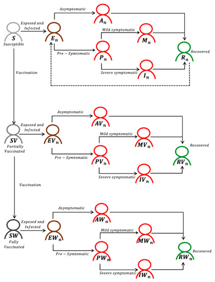 We developed an age-structured model of COVID-19 transmission and vaccination considering two co-circulating strains (Figure 1). Our model assumed that the mutant strain would be more transmissible on contact with an infectious person than the pre-existing, wild-type strain, i.e., . The model classified individuals according to their vaccination status and the natural history of COVID-19, considering the two strains. Additionally, as unvaccinated individuals are susceptible to both the wild and mutant strains, they were classified as follows: susceptible (); exposed (), asymptomatic (); pre-symptomatic (); mildly symptomatic (); severely symptomatic (); and recovered (). Similarly, partially (or fully) vaccinated individuals are divided into susceptible ( or ), exposed ( or ), asymptomatic ( or ), pre-symptomatic ( or ), mildly symptomatic ( or ), severely symptomatic ( or ), and recovered ( or ) categories. Here, the subscript k refers to the age group of individuals (k = 1, 2, …, 8), while the subscript j indicates the original strain (j = 1) or variant alpha (j = 2). Model population was stratified into eight age groups of 0–9, 10–19, 20–29, 30–39, 40–49, 50–59, 60–69, and 70+ years based on the Korean census data.