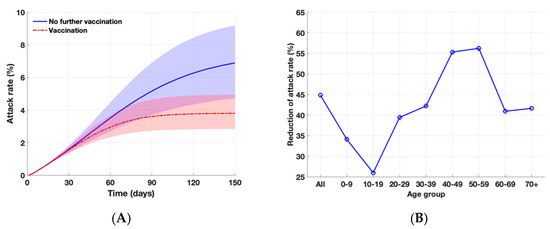 Impact of vaccination program against COVID-19 during the fourth wave in the absence of SARS-CoV-2 variant. (A) Projected cumulative attack rates over 150 days with and without further vaccination. The shaded areas represent the simulation outputs with lower and higher reproductive ratios of the wild type with Re = 1.1 and 1.3, respectively. (B) Overall and age-specific relative reduction of attack rates with vaccination, as compared to the outbreak scenario without further vaccination over 150 days.