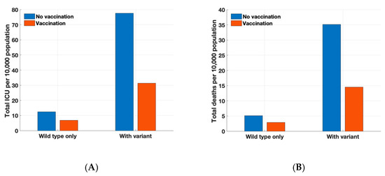 In the absence of vaccination, total intensive care unit (ICU) hospitalizations and deaths were projected to be 12.4 and 5.1 per 10,000 persons, respectively, on day 150 without the emergence of variant strains. Vaccination with reduced efficacy in elderly individuals still markedly reduced hospitalizations and deaths (Figure 4). Vaccination reduced infection outcomes, such as ICU hospitalizations and deaths, decreasing it by 45% and 43%, respectively. When we consider the situation after emergence of the Delta variant, further reduction in hospitalizations and deaths can be expected. In this scenario, total ICU hospitalizations and deaths were projected to be 77.6 and 35.1 per 10,000 persons, respectively, on day 150 without vaccines. Vaccination would reduce total ICU hospitalizations and deaths to 31.3 and 14.5 per 10,000 persons, respectively.