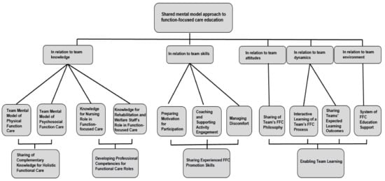 The primary themes were (1) sharing of complementary knowledge for holistic functional care, (2) developing professional competencies for functional care roles, (3) sharing experienced FFC promotion skills, and (4) enabling team learning. We described function-focused education for nursing home practitioners with the help of subthemes and themes related to a shared mental model derived from the data. Figure 1 presents the subthemes and themes in the coding tree chart to illustrate the complexity of shared mental model-based FFC education.
