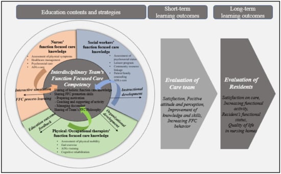 The generalizability of the study’s interdisciplinary education model is limited because the study included only a small sample of participants (30 practitioners and 12 experts) from just 5 NHs in some regions near the Seoul city. Therefore, this may limit the transferability of the findings to other older patient care settings, such as rural or small private NHs and hospitals. Nonetheless, this model was developed and agreed in collaboration with interdisciplinary practitioners in representative NH settings: nursing and rehabilitation professionals, including those from social welfare services and the NH management sector. The proposed FFC education model advocates strategies for implementing a care philosophy of FFC that promotes the functional ability of residents in NHs through an endeavor to improve practitioners’ shared cognition and a sense of worth to those contributing in team care. Based on our findings, further studies are needed to assess the effectiveness of a continuing interdisciplinary education program in NHs built on this preliminary education model. It will also be necessary to test this educational model and how its factors impact learning outcomes with a larger sample across more NH facility settings for greater time lengths, with both practitioners and residents. In addition, applying interdisciplinary education model for NH practitioners’ FFC delivery, an advanced FFC education training can address several levels of functional decline.