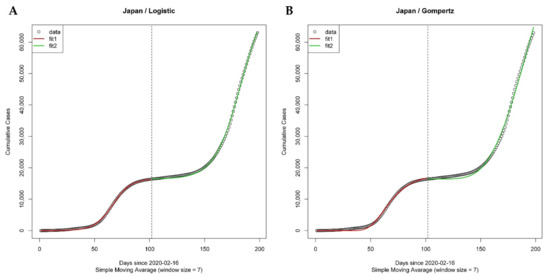 Cumulative confirmed cases divided into two segments using the segmentation algorithm. Japan is the typical country with two waves (red: first segment and green: second segment). (A) Epidemic segmented growth curve of COVID-19 fitted by the logistic model. Estimated parameters were ) = (16549.7588, 7.8244, 0.1231, 58877.8030, 6.7353, and 0.0859, respectively). (B) Epidemic segmented growth curve of COVID-19 fitted by the Gompertz model. Estimated parameters were ) = (17,531.5024, 89.4251, 0.0760, 98,622.3568, 15.6933, and 0.0325, respectively).