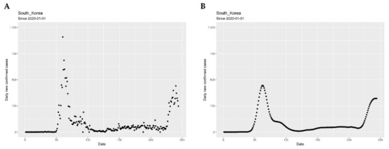 Segmentation is a method of finding peaks and breakpoints, where a peak is the timestamp at which daily new confirmed case is highest in a segment, and breakpoint is the timestamp that splits the consecutive two segments in a time series dataset. To better see trends, we smoothed out the irregular roughness of the graph of daily confirmed cases. However, daily new confirmed cases have high randomness arising from (1) the fact that daily new confirmed cases have a periodicity of seven days (due to differences in daily new confirmed cases between weekends and weekdays) and (2) measure errors of one day. Therefore, we applied the Nadaraya–Watson kernel regression estimator (NWE) [32,33,34] with Gaussian kernel to smoothen the daily new confirmed cases as demonstrated in Figure 2 using South Korea’s daily confirmed cases as an example. For the convenience of notation, let be the -th daily new confirmed cases from data, and be the estimated -th daily new confirmed cases using above NWE since 1 January 2020.