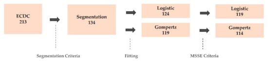 MSSE is a more suitable measure compared with MSE (mean squared error) or MAPE (mean absolute percentage error) because the MSE does not consider scales of population among each country, while MAPE overestimates its error when the number of daily new confirmed cases, and is small. Among the 134 countries, 124 countries were fitted for the segmented logistic model and 119 countries for the segmented Gompertz model. Among the fitted countries, 5 countries were excluded due to failure of meeting the MSSE criteria of 0.4 for segmented logistic and segmented Gompertz models. Therefore, a total of 119 countries were used in the segmented logistic model, and 114 countries for the segmented Gompertz model (Figure 3).