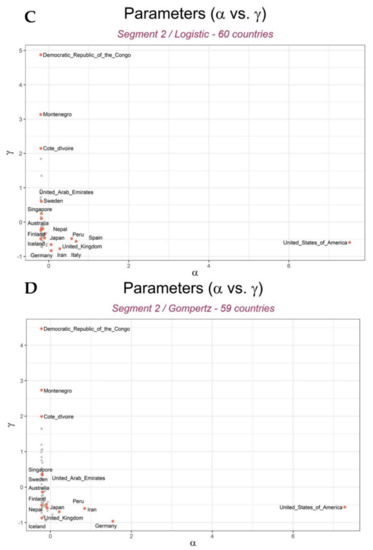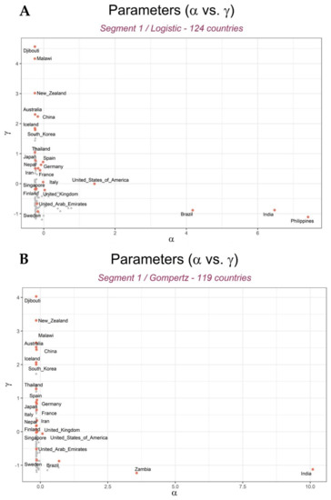 Furthermore, since the first day of the analysis period was set to the date when the number of cumulative confirmed cases exceeded 50 for each country, the population scale among countries was not considered. Thus, the time when we started to see a rise in the number of confirmed cases (β) did not produce consistent results between segments and models as the other parameters did, although its interpretation was the same between the models. Therefore, its results and any analysis concerning it were not a focus in our study, and its results were relegated to the Supplementary Materials for those interested. In addition, showed minimal correlation (−0.089 for logistic and 0.15 for Gompertz) between the two segments and with other parameters (e.g., −0.069 and 0.19 for logistic, 0.077 and 0.10 for Gompertz) in the same model, but it showed a strong positive correlation between the models (0.88 and 0.95).