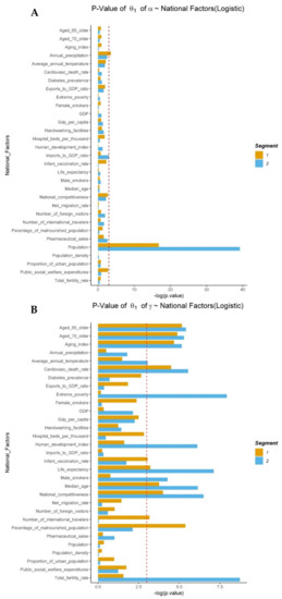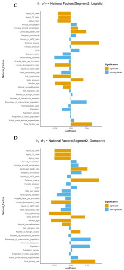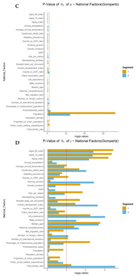 For the number of maximum predicted cumulative confirmed cases (), several national factors turned out to be significant, such as population, annual precipitation, pharmaceutical sales, and imports to GDP ratio (Figure 5A,C). However, population was the only variable that was outstandingly significant in both segments (1, 2) and models (logistic, Gompertz). The rate of spread of COVID-19 () was significantly related to 19 national factors. For example, age-related variables such as aging index, share of population aged 65 and older, share of population aged 70 and older, median age and life expectancy, health-related variables such as life cardiovascular death rate, share of female and male smokers in the population and percentage of malnourished people in the population, hospital beds per thousand, extreme poverty and human development index, cultural variables such as international travelers from a country and number of foreign visitors to a country, and environmental factors such as average annual temperature (Figure 5B,D).