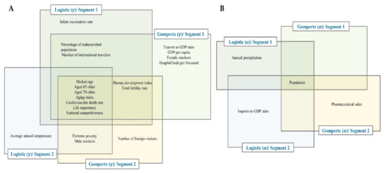 The rate of spread of COVID-19 is influenced by 16 significant variables in the Gompertz model, and 10 significant variables in the logistic model (Figure 7A). Age-related variables. i.e., aging index, median age, percentage of the population aged 65 or 70 and older, and life expectancy are significant in both models and segments. Aging is linked mainly with deteriorating immune system [39] and other common conditions such as hearing loss, cataracts and refractive errors, back and neck pain and osteoarthritis, chronic obstructive pulmonary disease, diabetes, depression, and dementia, wherein several of these conditions can be experienced at the same time [40,41]. The risk for severe illness with COVID-19 increases with age, with older adults being at a greater risk of requiring hospitalization and dying of COVID-19 when diagnosed in comparison with younger people. This is due to already deteriorating immune system, pre-existing conditions, and underlying medical problems (cardiovascular disease, diabetes, chronic respiratory disease, and cancer) that also makes them prone to newer infections [22,42,43,44]. This includes other variables such as cardiovascular death rate [45] and the percentage of female and male smokers in the population.