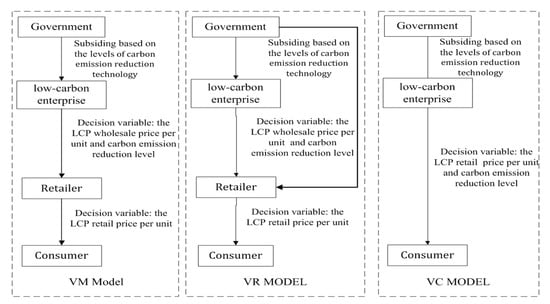 To promote carbon emission reduction technologies, the government subsidizes the LCSC based on levels of the carbon emission reduction technology. Subsidies for sources with low emissions to energy price ratios can change the relative price of low and high emissions energy sources and increase welfare benefits []. At present, China and other countries have gradually changed the carbon emission subsidy model, and determined the amount of subsidy by identifying carbon emission levels. This is an effective attempt to improve resource utilization efficiency and reduce carbon emissions. An example is Guangzhou’s subsidy strategy for electric vehicles: initially, fuel cell vehicles were given local subsidies at a ratio of no more than 1:1 of the national subsidy standard. For purely electric vehicles, local subsidies were given at a ratio of no more than 1:0.5 of the national subsidy standard. For plug-in hybrid (including supercharged) vehicles, local subsidies were provided at a ratio of no more than 1:0.3 of the national subsidy standard. After 2020, the subsidy policy will switch to a decreasing differential subsidy for vehicles with an electric range of no less than 400 km and a range of 250~400 km. The game theory model between a low-carbon enterprise and a retailer is established for analysis of the effect of government subsidies and the impact of subsidizing different recipients on the LCSC. In the decentralized decision model, the decision variables of the low-carbon enterprise are the wholesale price per unit and the levels of carbon emission reduction technology. Second, the decision variable of the retailer is the LCP retail price per unit in view of the wholesale price per unit and the levels of carbon emission reduction technology. By contrast, in the situations of centralized decision making, low-carbon companies are also responsible for production and sales, so the decision variable is the LCP retail price per unit and the levels of carbon emission reduction technology. The decision-making modes are shown in Figure 1.