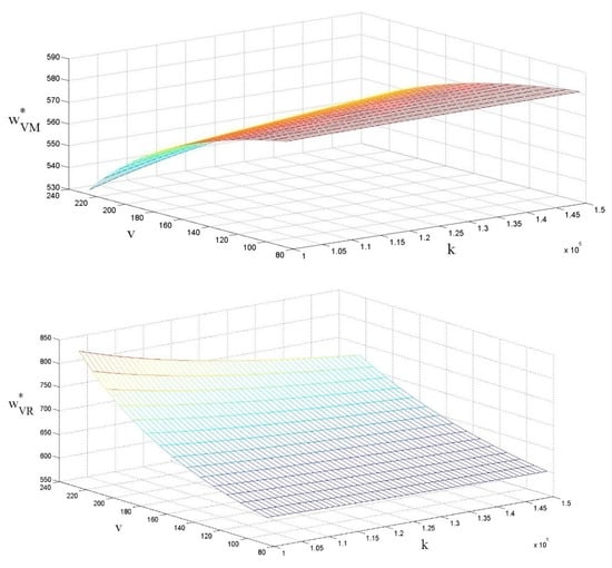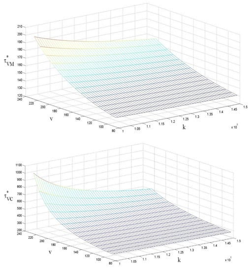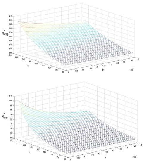 To further analyze the influences of government subsidies and carbon reduction costs on the optimal solution, this paper uses electric vehicles as a test case for numerical analysis. The subsidy model based on the carbon emission level makes the US automobile fuel industry and the electric power industry’s welfare gains 1% and 36% []. In 2020, the Chinese government’s subsidy strategy for electric and plug-in hybrid vehicles was (1) a subsidy of CNY 22,500 for each vehicle with a pure electric range of at least 400 km; (2) a subsidy of CNY 16,200 for each vehicle with a pure electric range between 250 km and 400 km; (3) a subsidy of CNY 8500 for each plug-in hybrid car with a range of no less than 50 km [,]. According to [], after processing the data, it is known that the potential market demand for a certain electric vehicle is 20,000, the unit retail price of consumers is 3, and the unit production cost is 500. Furthermore, according to the maximum and minimum government subsidies for certain electric vehicles, it can be seen that the variation range of the subsidy amount is (80,240). In addition, the variation of the cost coefficient of corporate carbon emission reduction technology is (1,1.5).
