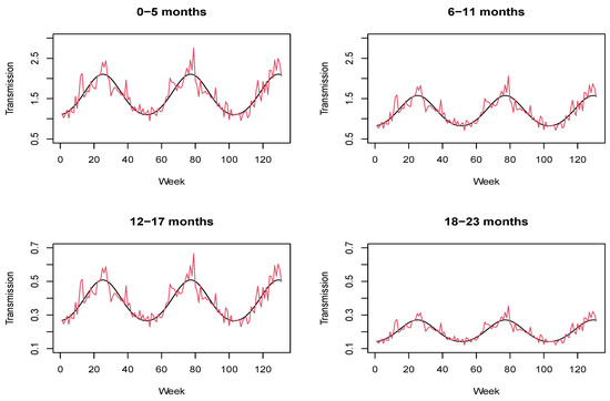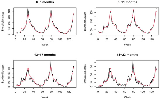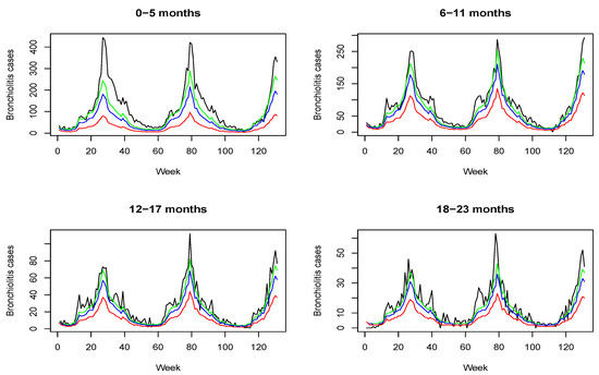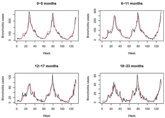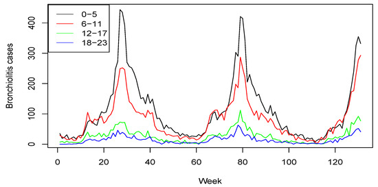 Considering that children aged less than 6 months have an elevated morbidity, we consider four age groups: 0–5, 6–11, 12–17 and 18–23 months of age. This grouping allows us to analyze in greater detail both transmission dynamics and the impact of potential immunization measures. Weekly aggregated cases from July 2010 (week 28 June–4 July) to December 2012 (week 24 December–30 December) are considered (T = 131 weeks in total). Since this is a population-based cohort study, data for all the age groups were not available until July 2010, so data from January 2009 to June 2010 are excluded in the analysis. In total, the study includes 30,555 cases of bronchiolitis: 14,635 (47.90%) of them are in children aged less than 6 months, 10,600 (34.69%) cases in the age group of 6–11 months, 3462 (11.33%) in the age group of 12–17 months and 1858 (6.08%) in the age group of 18–23 months. Figure 1 shows the time plot of the series for the four age groups. As can be seen, there is a higher incidence for younger children and a clear seasonal pattern, with more cases during the weeks of autumn and winter. These data can be downloaded from https://rotapp.shinyapps.io/APP_IMPACTO_RSV, (accessed on 14 May 2021).