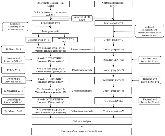 The present study was a non-randomised, quasi-experimental longitudinal intervention study with one intervention group and a control group, with participants recruited from two nursing homes. The intervention took place in a Nursing Home (NH1), in the north of Italy. All the residents of the facility were involved in the activity, forming the intervention group with older adults with and without dementia. The older adults of the control group were recruited in a different Nursing Home (NH2), with the same features of the aforementioned. Both experimental groups carried out the same physical activity program for a year, while the control group continued with their usual routine. During the experimental year, control tests were carried out every four months for a total of four tests: a pre-test before the starting, a post-test at the end of the intervention and two mid-tests, one in the fourth and one in the eighth month. All the measures were undertaken in both nursing homes during the same period. Figure 1 shows the study design. The physical functioning tests were implemented by a physical activity professional, while the questionnaires were implemented by a professional psychologist. The ethical committee of the University of Torino approved the study. Participants were informed that their participation in the study was voluntary and confidential. Participants gave their informed written consent to participate in the study in accordance with the local medical ethics committee and in compliance with the ethical standards provided in the 1964 Declaration of Helsinki.