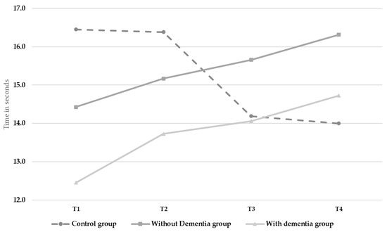 There was a significant interaction effect between time and group for mobility (Tinetti test, F(187.265) = 17.775, p < 0.001, ηp2 = 0.249). As shown in Figure 2, mobility decreased over time in the control group (from 16.45 to 14) but increased in both of the Intervention Group (I.G. without dementia from 14.43 to 16.31; I.G. with dementia from 12.45 to 14.73). There was also a significant interaction effect observed for the self-perceived fatigue ratings (F(4229.661) = 11.134, p < 0.001, ηp2 = 0.171) which reflected an increase over time in the control group (from 3.95 to 5.36) whilst ratings for both intervention groups remained relatively stable across time (Table 2). The control variables showed no effects.