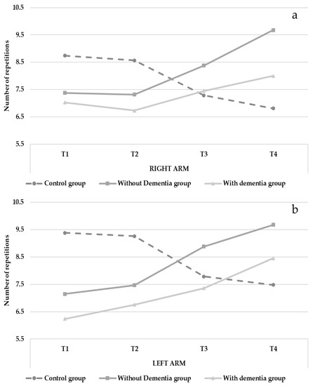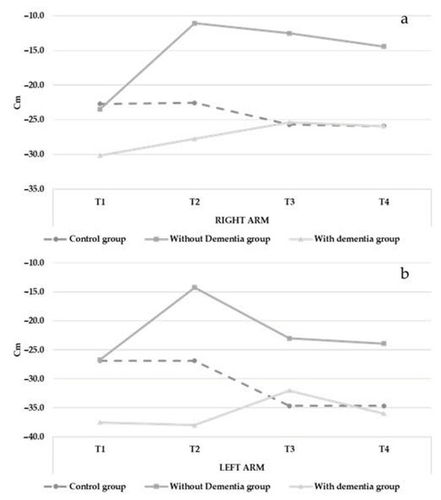 Analysis of the back scratch test data revealed significant interaction effects observed in both arms (R arm, F(86.892) = 3.695, p < 0.05; L arm, F(220.035) = 4.013, p < 0.01). Flexibility and mobility of the shoulders decreased over time in the control group (R arm from −22.71 to −25.90; L arm from −26.86 to −34.67) but improved over time in the intervention groups (I.G. without dementia: R arm from −23.45 to −14.45; L arm from −26.70 to −23.90; I.G. with dementia: R arm from −30.12 to −27.87; L arm from −37.50 to −36.00, See Figure 4 and Table 2). The control variables showed no effects.