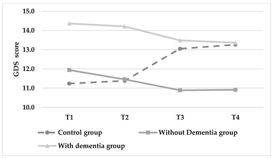 Changes in depression (GDS) score over time (lower score indicates greater autonomy in daily living situations).