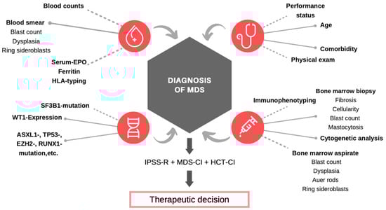 The diagnosis of MDS may be suggested by a patients’ medical history and a thorough physical examination, confirmed by the microscopic examination of blood and bone marrow specimens, and corroborated by cytogenetics, flow cytometry, and mutation analysis. The complete array of diagnostic techniques may be required to rule out the most important differential diagnoses, i.e., AML and aplastic anemia (AA). Following standardized procedures improves the accuracy and swiftness of diagnosis and allows for the identification of possible therapeutic targets (Figure 1).