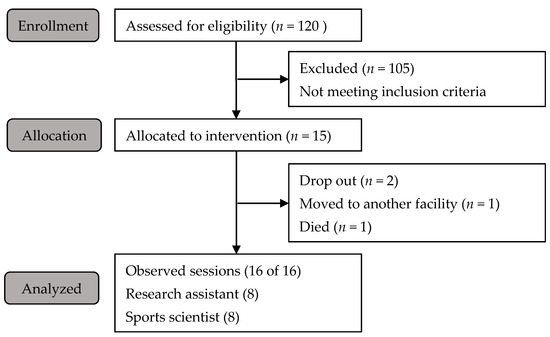 Feasibility (1) of the intervention was assessed by means of a standardized observation protocol. For all sessions the retention rate (dropouts, attendance, and adverse events) and, after consultation with the nurse, the number of residents who showed signs of apathy and therefore could not actively participate, were documented. In addition, exercise quantity (the number of exercises planned and performed per session) was documented. For eight sessions a research assistant documented the performance quality divided into active (“exercise was performed correctly” or “attempts were made to perform the exercise”) and inactive (“no response”). All sessions were documented by the sports scientist and the observation of the performance quality was documented by an additional research assistant. Following each session, the sports scientist, the nurse, and the research assistant discussed the observations (Section 2.2).