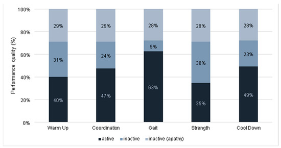 The mean activity rate for the eight sessions assessed by the research assistant was 46% (Table A2). During these sessions, an average of 29% of participants was inactive due to apathy. For the different components, the highest activity rate was observed for the gait exercise (63%). The lowest activity rate was observed during the strength exercises (35%) (Figure 2).
