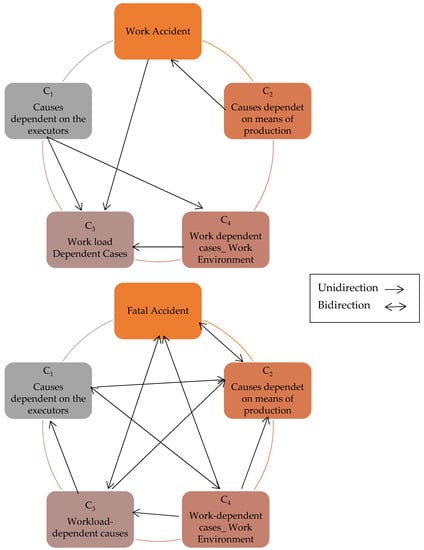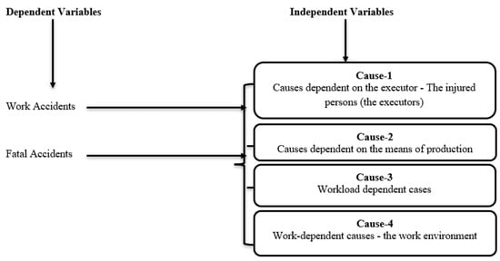 Accidents at work in different fields of activity fall in specific directions. These directions concern the worker, the work environment, the production process, or the employee [,]. Depending on the severity, the two categories for work accidents can be delimited: non-fatal and fatal accidents at work [,]. Therefore, these work accidents are caused by causal elements. The systemic principle of approaching the work processes requires expressing the causes on the four elements: the executor, the means of production, the workload, and the work environment. This procedure is also followed if the work process is complex or less complex. The work process elements are characterized by attributes, states, phenomena, and behaviors. These features can lead to a system malfunction. This dysfunction can cause accidents at work and/or occupational diseases, together called risk factors. These risk factors can be potential causes of accidents at work or occupational diseases. If an accident at work or occupational disease has occurred, the causes of these elements must be identified. The government should increase work accident data quality [].