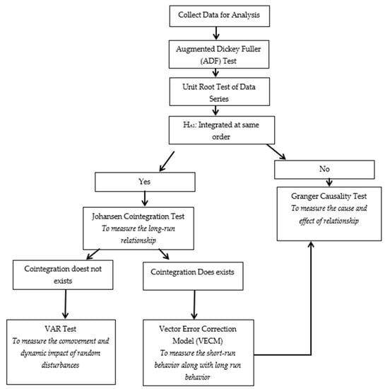 The research methodology for this article is alienated into four sub-sections that are (1) stationarity test or unit-root test. (2) Cointegration test is employed after confirmation of integration order and stationarity of data series. In this research, the Johansen cointegration test is employed to check long-run relationships or long-run equilibrium among series with a linear combination of variables. (3) The vector error correction model (VECM) is used to determine the causality direction of variables after confirmation of the cointegration relation. The fourth method is the Granger causality test used to check individual variable direction and relationships with another individual. A flowchart of the complete methodology is pictorially presented in Figure 2. In this study, Eviews-10 is used to run the Johansen cointegration model, VECM, and Granger causality test for data analysis.
