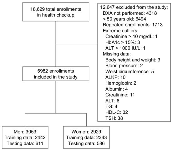 Out of 18,629 enrollments, 12,647 were excluded due to DXA not performed, age under 50 years old, repeated enrollment of the same individual, extreme outliers including creatinine > 10 mg/dL, Hemoglobin A1c (HbA1c) > 15%, alanine transaminase (ALT) > 1000 IU/L, and other missing data. The remaining 5982 enrollments were included for further analysis. The flowchart of data inclusion and preprocessing is shown in Figure 1.
