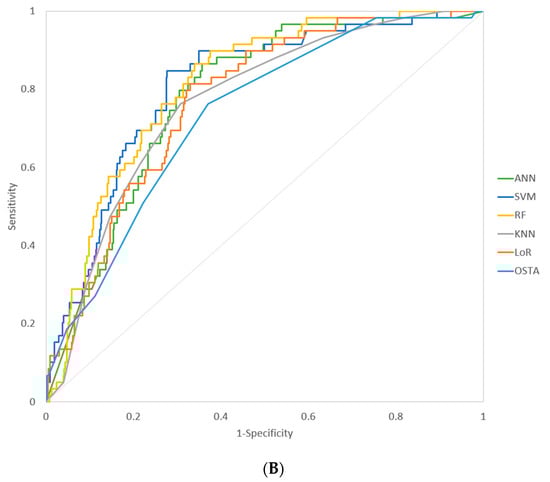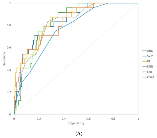 In the five machine learning models (ANN, SVM, RF, KNN, LoR) and the traditional model (OSTA), the AUROC, sensitivity, and specificity were presented in Table 4. The sensitivity and specificity were calculated at the cutoff value determined by maximization of weighted Youden index at weighted 0.6. The resultant cutoff value was <3 in men and <0 for women in the OSTA model. Overall, for the prediction of osteoporosis in men, the machine learning models obtained 83–96% sensitivity and 53–73% specificity; for the prediction of osteoporosis in women, the machine learning models obtained 76–90% sensitivity and 62–69% specificity. Additionally, we compared the AUROC between the machine learning models and OSTA. The ANN, SVM, RF, LoR models in men, and the ANN, SVM, RF models in women performed significantly better than the OSTA model. The ROC curves of different machine learning models in men and women were presented in Figure 2A,B.