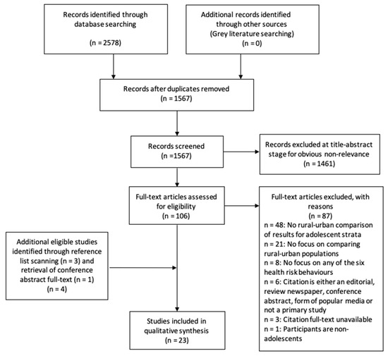 Our systematic search ultimately yielded 23 unique studies [42,43,44,45,46,47,48,49,50,51,52,53,54,55,56,57,58,59,60,61,62,63,64] which met all of our inclusion criteria (Figure 1). Studies excluded at the full-text stage were most frequently excluded on the basis of the following a priori exclusion criteria: not presenting rural–urban comparison of results specifically for adolescent-specific strata, for not comparing rural–urban populations at all, and/or for not focusing on any of the six HRBs that were deemed priorities in this review. Other reasons that studies were excluded not being an observational quantitative, qualitative or intervention study, not including adolescents or because the full-text article was unavailable.