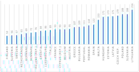 Incarceration rate in the European Union countries (June 2021). Source: Authors’ own study based on data retrieved from: https://www.prisonstudies.org/map/europe (accessed on 23 June 2021) [43].