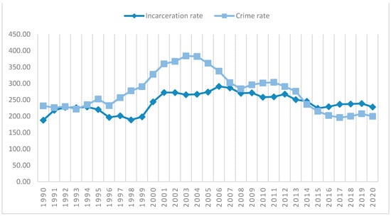 Incarceration rate versus crime rate in Poland (1990–2020). For the purpose of visual presentation in Figure 3, the crime rate was calculated as a total number of established criminal cases per 10,000 citizens. Source: Authors’ own study based on data retrieved from: https://www.sw.gov.pl/strona/statystyka-roczna, https://stat.gov.pl/en/, and https://statystyka.policja.pl/ (accessed on 23 June 2021) [44,45,46].