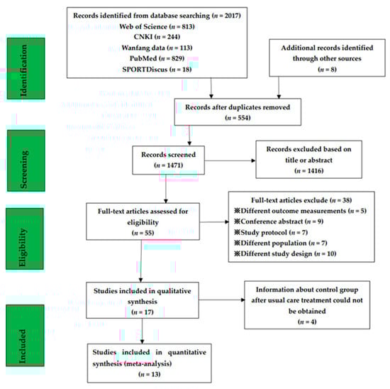Figure 1 shows the retrieved results. To the first week of April 2021, 2017 studies were confirmed from five databases and other sources in the search. After duplicate publications were deleted, 55 publications were evaluated by their titles. A total of 17 qualitative articles were obtained and 13 quantitative studies were confirmed to be included. No Chinese literature meeting the inclusion criteria was found. The main reasons for exclusion were outcome indicators that did not fulfill inclusion criteria. The selection process is shown in Figure 1. The characteristics of all the 13 included studies were based on frequency, intensity, duration, and type (FIDT) (Table 2). The operational and control groups of 13 studies were all PF patients [,,,,,,,,,,,,]; thirteen studies compared interventions with exercise training to regular cares. Thirteen studies concerned aerobic exercise [,,,,,,,,,,,,]. Twelve concerned resistance exercise [,,,,,,,,,,,]. Five studies included flexibility exercises [,,,,] and four studies included breathing exercises [,,,]. Eleven studies had an exercise duration of three months or less [,,,,,,,,,,], and five studies had a duration of more than three months [,,,,]. The quality assessment results showed a decline in individual studies and black quality index scores, as shown in Table 1. Of the 13 included studies, eleven were of GQ [,,,,,,,,,,] and two were FQ [,].