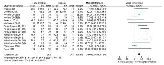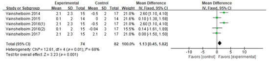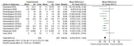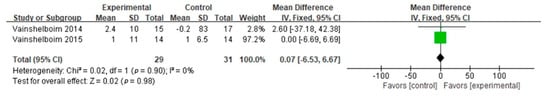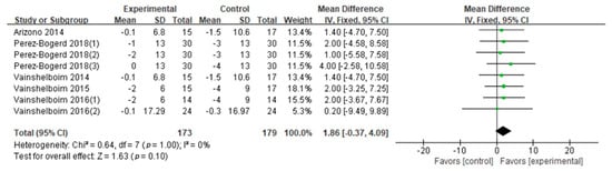 The number 1 represents the baseline, and number 2 represents the follow-ups. We assumed an R value of 0.40 to impute the missing SD of the mean within-group change according to Follman et al. []. In this study, the effect size was represented by d, and the result size by MD. If a study reported results for different durations, each of them was treated as a separate trial []. The Cochrane systematic review software Review Manager (version 5.3.5) was used to map the forest. In addition, the 95% confidence intervals were calculated by this software. Meta-analysis was conducted to evaluate the effects of training interventions on PF. Heterogeneity in the studies was analyzed by a forest plot, and the heterogeneity was quantitatively determined by I2. This study had a low heterogeneity; therefore, a fixed-effect model was adopted for meta-analysis. If there was statistical heterogeneity among the results, its source was analyzed further, and significant heterogeneity was treated by subgroup analysis.