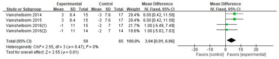 Table 3. Subgroup analysis results. - Peak VO2: Peak VO2 was evaluated in four GQ studies [,,,]. The difference of the peak VO2 between two conditions supported PF patients engaging in exercise training (Cohen’s d = 0.45, MD: 1.13; 95% CI: 0.45 to 1.82; Z = 3.23, p = 0.0001) (Figure 3). Due to the high heterogeneity (I2 = 68%), a subgroup analysis of exercise duration was performed (Table 3). It that showed two GQ studies [,] focused on long durations (Cohen’s d = 0.74, p = 0.84) and three GQ studies [,,] focused on short durations (Cohen’s d = 0.05, p < 0.01). Although the exercise duration difference between subgroups was significant (p = 0.03), the confidence intervals overlapped. Accordingly, we conclude that exercise duration has no effect on peak VO2.