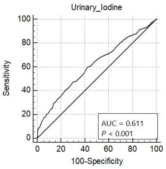 Table 3 and Figure 1 show ROC curve analysis of the projection of urinary iodine content for stunting. The ability of urinary iodine content to predict stunting was good (AUC = 0.611, 95% CI: 0.594–0.629). The ROC curve identified the optimum cutoff point of urinary iodine content to be ≤19.0 µg/L. The sensitivity was 59.66% (95% CI: 53.1–66.0) and the specificity was 57.62% (95% CI: 55.8–59.5).