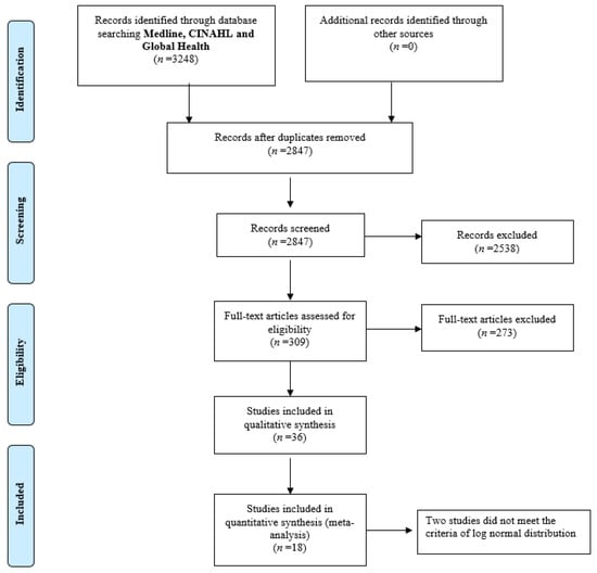 The systematic search revealed 3248 papers. Following the removal of duplicates, 2849 remained for title and abstract screening. Once the title and the abstracts were screened, 309 papers were available for full text review. Of those, 36 published papers met the inclusion criteria and reported estimates on premature mortality (Figure 1). Sixteen of these papers were included in the Bayesian hierarchical meta-analysis.