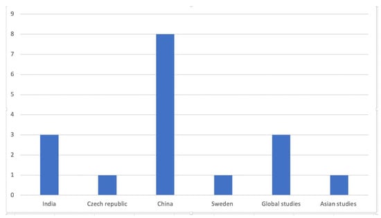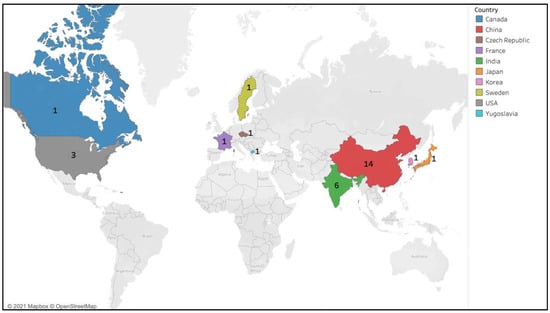 The 36 published papers came from various countries; six were from India [,,,,,], three from the USA [,,], 14 from China [,,,,,,,,,,,,,] and one each from Korea [], Czech Republic [], Canada [], France [], Yugoslavia [], Japan [] and Sweden []. There were four global studies [,,,] and two studies from the Asian region [,] (Table 1 and Table 2, Figure 2). Figure 2 shows the geographic distribution of the included studies, with the exception of the global and the Asian region studies.