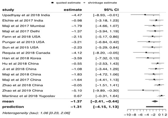 Similarly, the transformed results of the PM10 forest plot (Figure 5) indicate that the annual estimate of premature mortality due to exposure to PM10 was 587 (95%CI: 1, 39,746) deaths per 1,000,000 population. However, when the sampling errors of individual studies were removed, the predicted mean result for a future study was 645 (95%CI: 0, 16,106) per 1,000,000 population.
