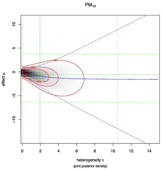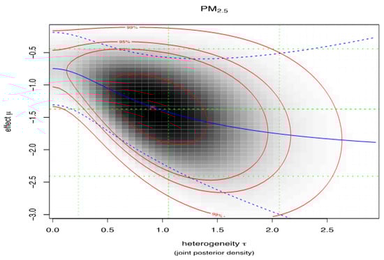 Figure 6 and Figure 7 illustrate the joint posterior density of heterogeneity τ and the effect µ (log mortality rate), for PM2.5 and PM10, respectively. The darker area on the plots indicates the area of higher probability density. Red lines represent the 50%, 90%, 95% and 99% credible intervals of the joint distribution. The blue solid line is the conditional posterior mean log mortality rate as a function of heterogeneity, with the blue dashed lines corresponding to the 95% credible interval. The green lines indicate the marginal posterior median and 95% credible intervals for both parameters.