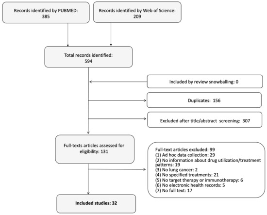 We searched PubMed and ISI Web of Science databases for retrieving the articles of interest that were published from January 2016 to August 2020. Due to the approval of immunotherapy in 2015, January 2016 was chosen as starting date to give a more up-to-date picture of the issue [11]. The search string used was composed by three sets of keywords respectively related to the concepts “lung cancer”, “drug-utilization measures”, and “type of study/Data”, respectively (see Supplementary Materials—Table S1 for more details). Snowballing search was also conducted to retrieve additional papers of interest by examining the references cited in the included articles.