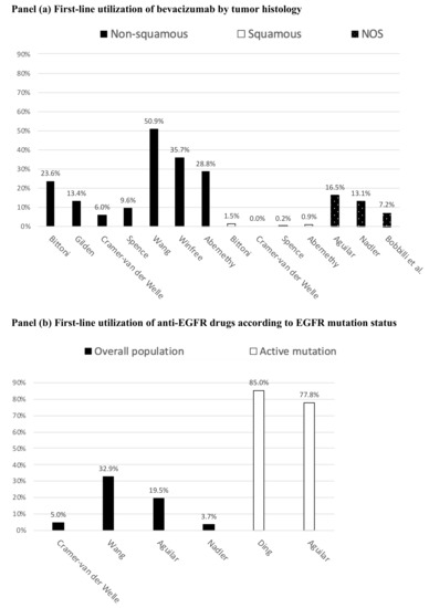 Reported incidence of use of innovative drugs as first-line pharmacotherapy for advanced non-small-cell lung cancers (NSCLC). (a) First-line utilization of bevacizumab by tumor histology; (b) First-line utilization of anti-EGFR drugs according to EGFR mutation status; NOS: not otherwise specified.