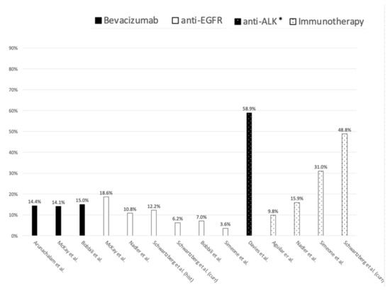 Eight studies from the US concerned anti-EGFR therapies as second-line in patients with advanced NSCLC [34,37,49,50,51,52,53,54]. All the eight studies described the use of erlotinib, of which three described also the use of gefinitib, afatinib and osimertinib [49,53,54]. Five studies showed that the incidence of use of second-line anti-EGFR utilization among advanced NSCLC patients ranged between 3.6% and 18.6% [34,37,50,51,53]. Four US studies reported the use of anti-ALK therapies as second-line therapy [46,48,52,54]. Two out of four studies described the use of anti-ALK medications in an ALK mutated NSCLC cohort [46,48], while the remaining two studies concerned a cohort of patients included regardless of molecular characteristics of the tumor.