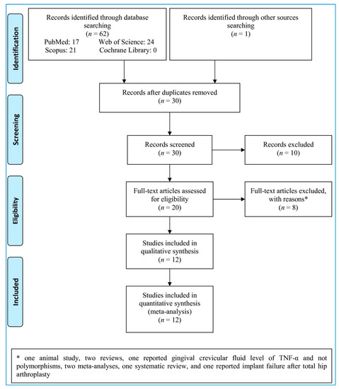 Through the electronic and manual search, 63 records were identified (Figure 1). After removing the duplicates, 30 records were screened, while 10 irrelevant records were removed. A total of 20 full-text articles were evaluated for possible inclusion, and 8 of them were deemed irrelevant and excluded with reasons (one animal study, two reviews, one reported gingival crevicular fluid level of TNF-α and not polymorphisms, two meta-analyses, one systematic review, and one reported implant failure after total hip arthroplasty). Finally, 12 studies were included in our analysis.