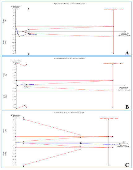 Trial sequential analysis for the association between polymorphisms and dental peri-implant disease risk based on heterozygous model: (A) TNF-α (−308 G > A), (B) IL-10 (−1082 A > G), and (C) IL-10 (−819 C > T).
