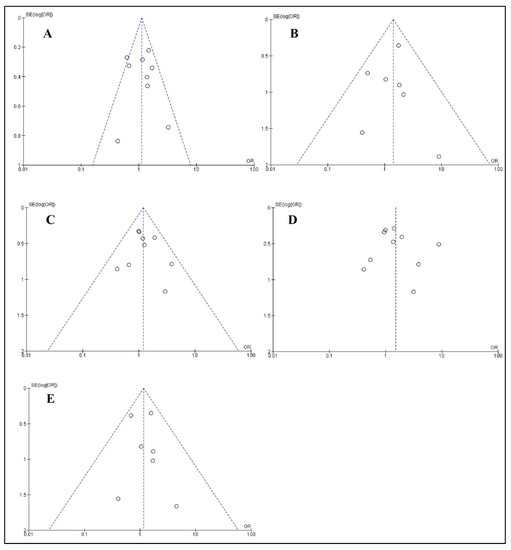Funnel plot analyses of five genetic models for the association between TNF-α (−308 G > A) polymorphism and peri-implant disease risk: (A) allelic, (B) homozygous, (C) heterozygous, (D) recessive, and (E) dominant.