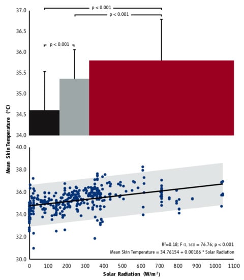 The average (±SD) mean skin temperature in indoor (black), mixed (grey), and outdoor (red) environments characterized by the same thermal stress (30 °C WBGT) but different solar radiation levels (top graph) as well as the association between hourly mean skin temperature and solar radiation (bottom graph). The bar width in the top graph indicates the range of solar radiation of each category corresponding to the horizontal axis, while horizontal brackets indicate statistically significant differences. Shading in the bottom graph corresponds to the 95% prediction interval.