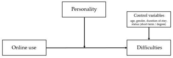 Importantly, personality traits also play an important role as a moderator for technology use [45]. For instance, a study on German and Chinese individuals showed that higher levels of neuroticism and lower levels of conscientiousness are strongly associated with problematic internet use [46]. Furthermore, students’ attitude toward social media was moderated by their degree of openness and neuroticism [47]. Given these findings and those of other studies, which suggest that an individual’s internet use habits are highly related to their personality [48,49,50] and with the environment with which they interact [51], it is therefore interesting to determine whether study abroad difficulties are affected by an individual’s internet use and personality.