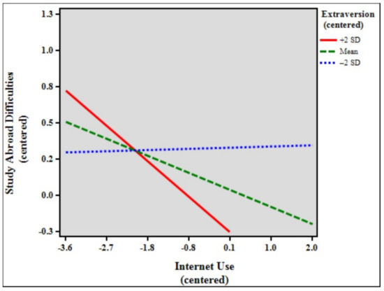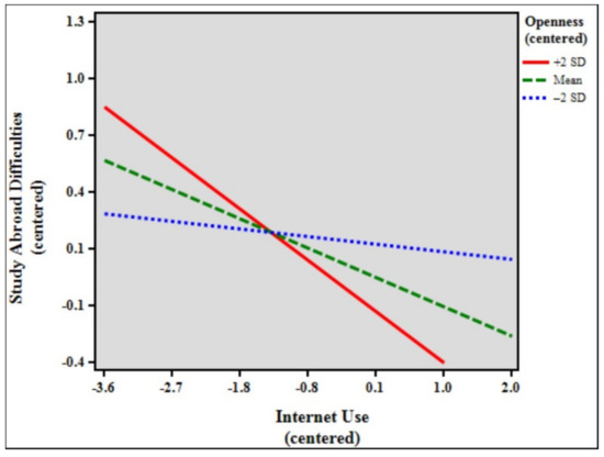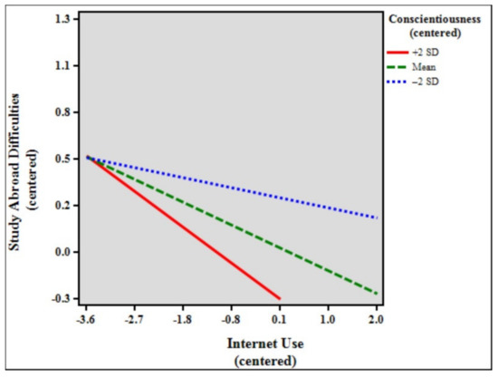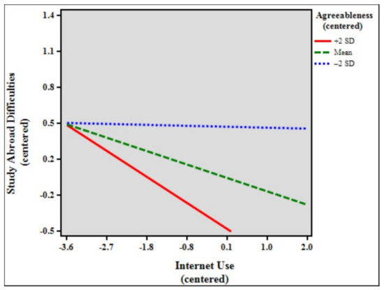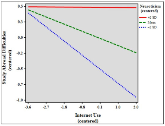Lastly, to further understand the effects of extreme personalities—high personality traits (+2 SD) and low personality traits (−2 SD)—simple slopes difference tests were performed. The findings show significant differences between all the high personality traits and their lower counterparts. Further analyses of the results revealed particularly interesting findings. While the moderating effect of conscientiousness was not statistically significant in the previous analysis, simple slopes comparisons showed that when the sample was separated into high (+2 SD, n = 48), mean (n = 1781), and low (−2 SD, n = 41) conscientiousness, the moderating effects of both high and mean conscientiousness were, in fact, significant (see Table 5, simple slopes models). Furthermore, for the personality traits openness, extraversion, and agreeableness, the moderating effects of low (−2 SD) ratings were also not significant. Figure 2, Figure 4, and Figure 5 show that low (blue broken lines) ratings for personality traits exhibit small to very small slopes (almost a straight line for agreeableness), signifying that study abroad difficulties are almost not affected at all by internet use. Likewise, the moderating effect of high (+2 SD) neuroticism was not significant. Importantly, Figure 6 shows that the slope for high neuroticism (red line) is almost a straight line, denoting that study abroad difficulties are not affected at all by internet use.