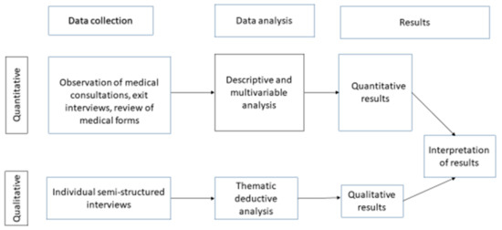 This was a mixed-methods convergent parallel study [32,33] with the quantitative aspect as the dominant part of the study. A cross sectional design was used to collect quantitative data through interviews and observations. We used individual interviews for qualitative data collection. We used a mixed method research design to ensure validity of the study by complementing findings in the quantitative study arm with the qualitative findings. We used the quantitative methods to quantify child consultations that are managed appropriately, while qualitative methods were used to understand how care providers and policymakers perceived the quality of care provided by LLPHF. Data were analyzed separately and merged at interpretation of the results as illustrated in Figure 1.