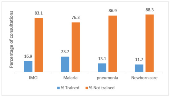 The majority of the consultations were carried out by health workers who had not had any refresher training in IMCI nor other stand-alone refresher trainings in the management of common childhood illnesses in the past 6 years as shown in Figure 2.