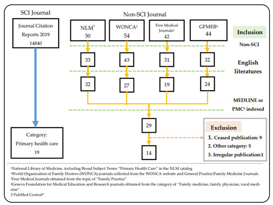 For the collection of non-SCI journals, we filtered the journals collected from different databases in the same way. First, all non-SCI journals were collected; then, all English journals were selected, and the duplicate journals were sorted, resulting in a total of 61 journals, and 29 journals were obtained after searching and comparing with the journal lists provided by MEDLINE [17] and PMC [18]. The status of each journal was reviewed manually, excluding nine journals that have been discontinued and five journals that belong to other disciplines, such as neurology and cardiology, or the Social Science Citation Index. Among them, although the Asia Pacific Family Medicine journal was indexed in PubMed, its publication was not included in PubMed in 2020, and the journal will be handled by WONCA in 2021, so it was listed as an irregular publication. Finally, a total of 14 non-SCI family medicine journals were included (Figure 1).